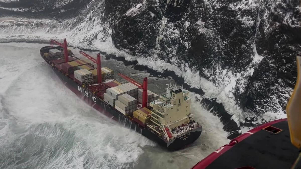 Các đợt thời tiết khắc nghiệt tại Bắc Đại Tây Dương đã khiến tình trạng xác tàu container MSC Baltic III xấu đi đáng kể. Con tàu mắc cạn trên đá gần Lark Harbor, Newfoundland từ tháng 2 năm 2025.