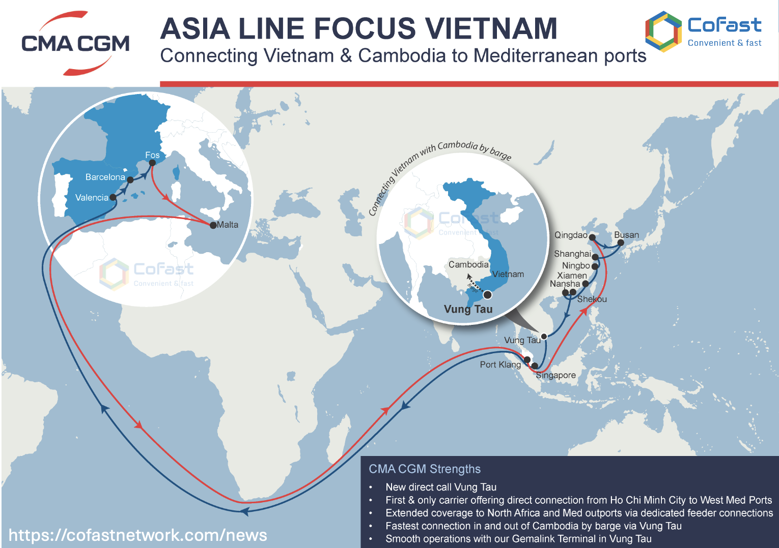Bằng việc kết hợp tuyến MEX1, liên kết nội Á qua Phnom Penh, và mạng lưới các cảng chiến lược tại Địa Trung Hải (Valencia, Fos-sur-Mer, Malta), CMA CGM đang từng bước củng cố vai trò trung tâm của Việt Nam trong chuỗi cung ứng toàn cầu.