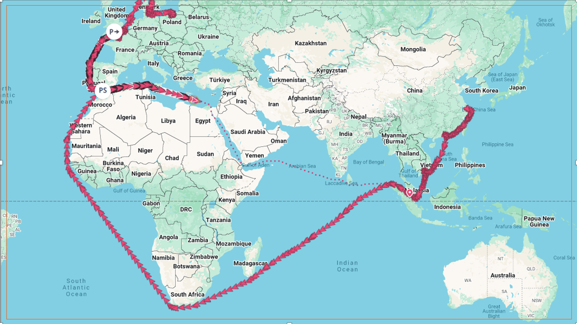 Theo dữ liệu theo dõi tàu, CMA CGM Benjamin Franklin hiện đang tiến gần cảng Alexandria (Ai Cập) sau khi rời Southampton (Anh) ngày 25 tháng 10. Điểm đến AIS được ghi là Port Klang (Malaysia).