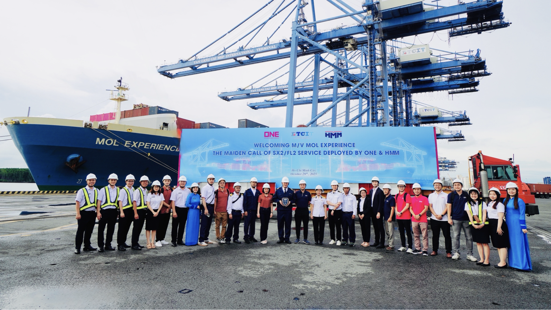 Khoảnh khắc lưu niệm giữa TCSG, TCIT, ONE, HMM và thủy thủ đoàn trong lễ đón tàu MOL EXPERIENCE – chuyến đầu tiên của tuyến SX2/FL2. Ảnh: Tân Cảng - Cái Mép (TCIT)
