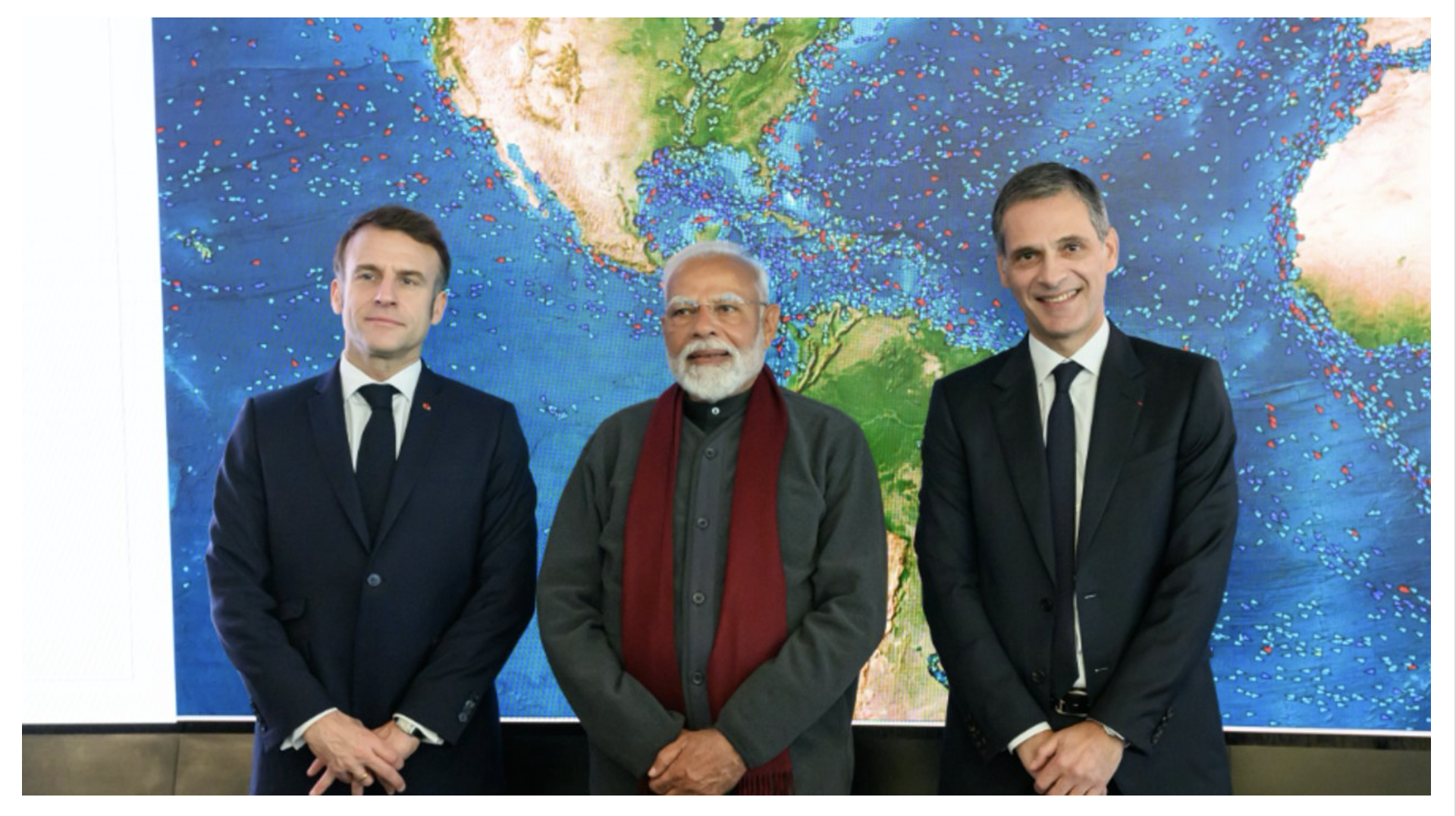 Indian Prime Minister Narendra Modi (center) and French President Emmanuel Macron (left) visit CMA CGM headquarters in Marseille, where they meet Rodolphe Saadé, Chairman and CEO of the Group (right), on February 12, 2025.