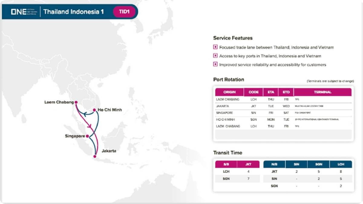 Ocean Network Express công bố nâng cấp tuyến Thailand - Indonesia 1, ký hiệu TID1, với thay đổi chính là loại bỏ điểm dừng Surabaya tại Indonesia và bổ sung hai cảng Singapore và TP.HCM vào vòng quay khai thác.