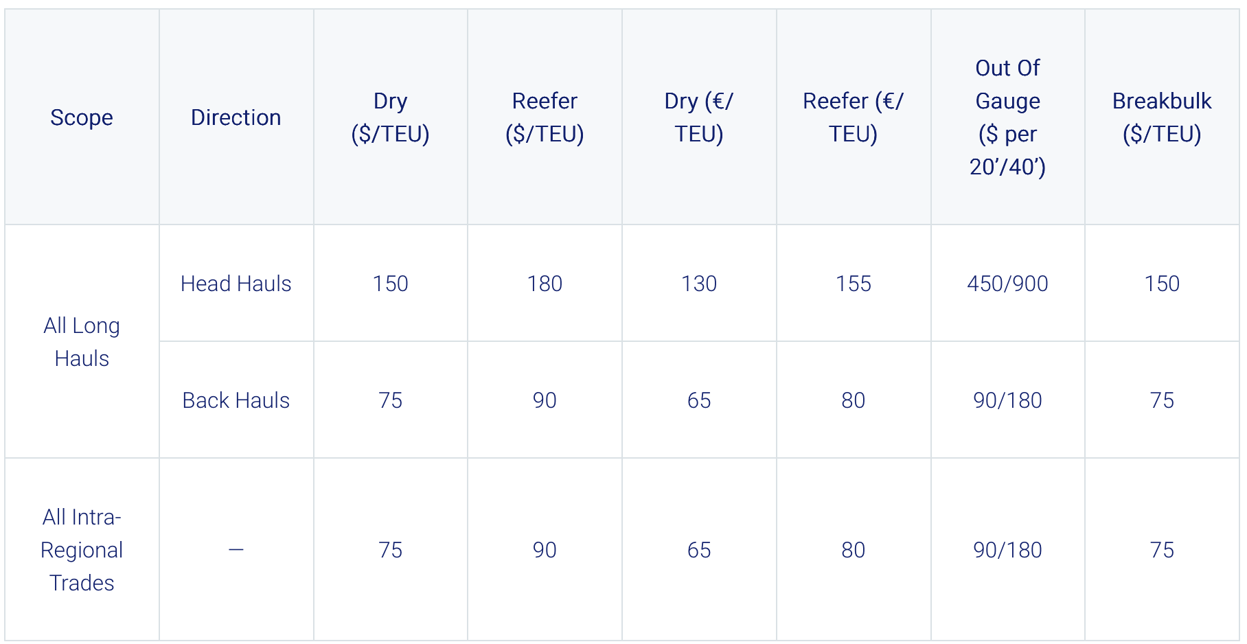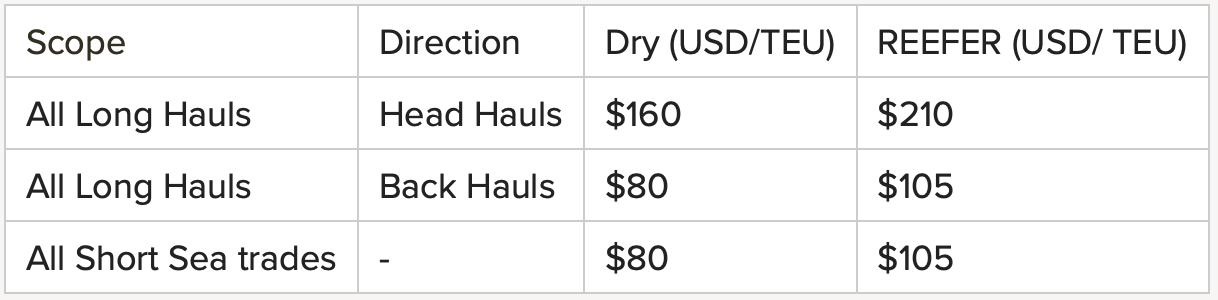 Các mức phụ phí này áp dụng đối với các hợp đồng vận chuyển ngắn hạn và sẽ duy trì cho đến khi có thông báo mới.